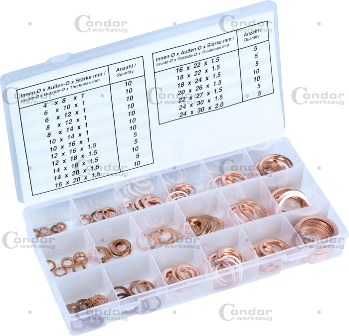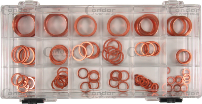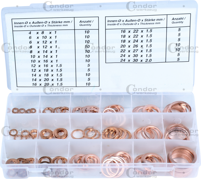 19 populära storlekar (inner-ø x ytter-ø x tjocklek): 10 delar. 4x8x1.0 mm, 10 delar. 6x10x1.0 mm, 10 delar. 6x12x1.0 mm, 10 delar. 8x12x1.0 mm, 10 delar. 8x14x1.0 mm, 10 delar. 10x14x1.0 mm, 10 delar. 10x16x1.0 mm, 5 delar. 12x16x1.5 mm, 5 delar. 12x18x1.5 mm, 10 delar. 14x18x1.5 mm, 5 delar. 14x20x1.5 mm, 10 delar. 16x20x1.5 mm, 5 delar. 16x22x1.5 mm, 5 delar. 18x22x1.5 mm, 5 delar. 18x24x1.5 mm, 10 delar. 20x26x1.5 mm, 10 delar. 22x27x1.5 mm, 5 delar. 24x30x1.5 mm, 5 delar. 24x30x2.0 mm