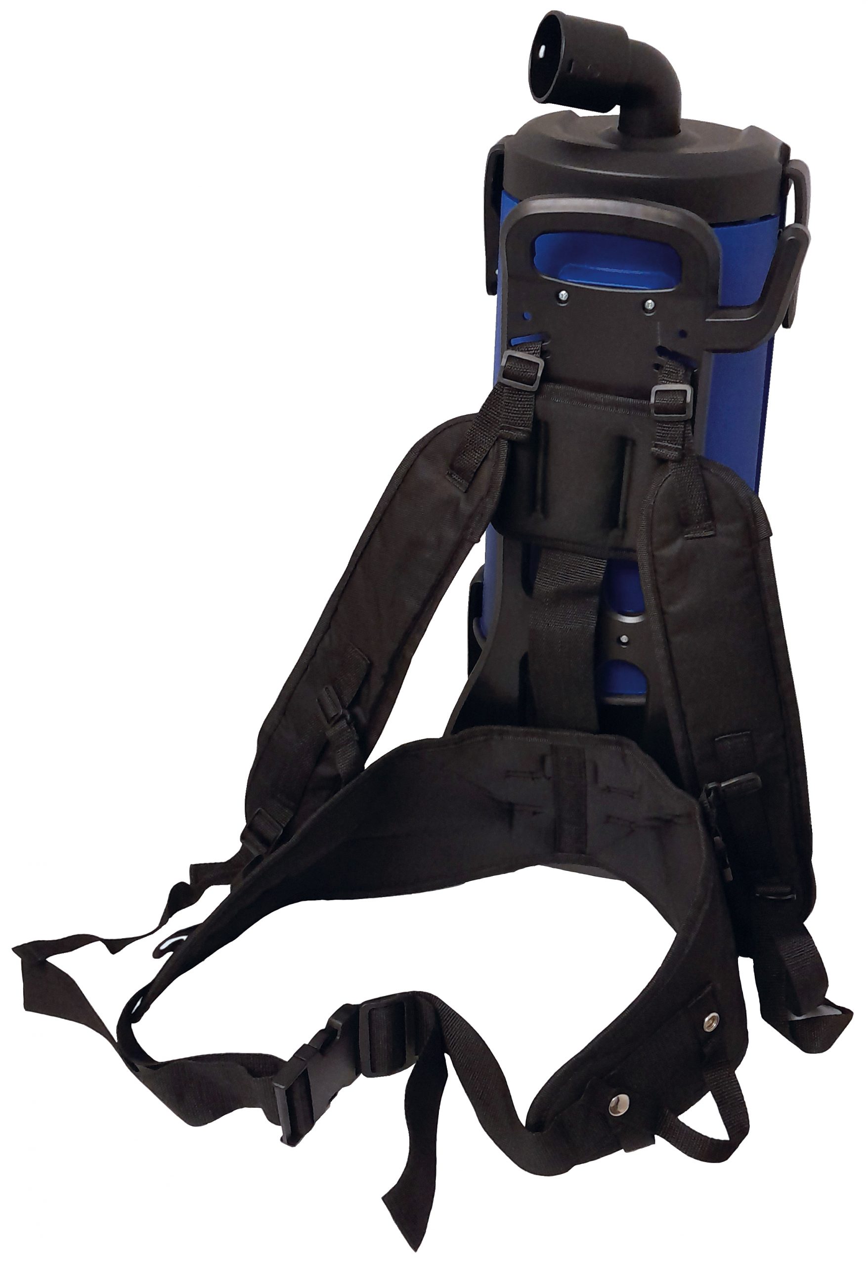 Smidig ryggburen dammsugare för yrkesbruk. Levereras komplett med städset och förlängningssladd.