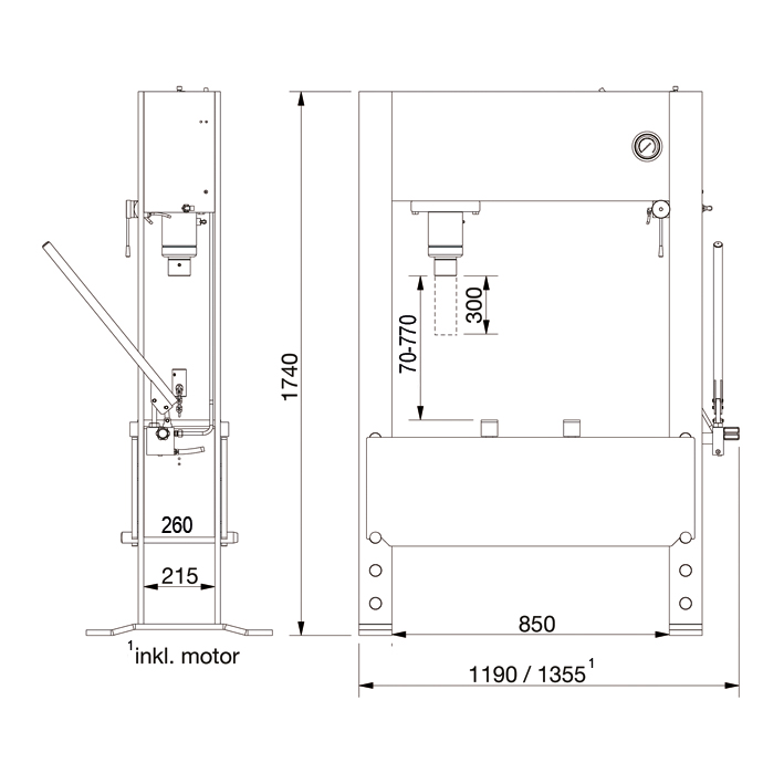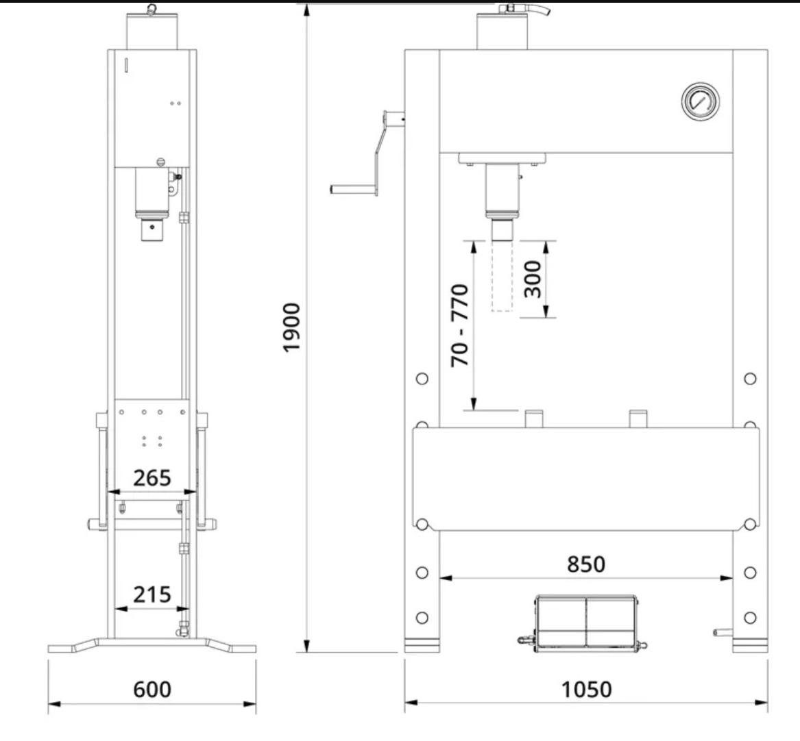 Lufthydraulisk 1-stegs pump (Presshastighet: 6,1 mm/s). Steglös inställning av presstryck. Dubbelverkande och sidledes flyttbar cylinder. Stor slaglängd på 300 mm. Inbyggd manometer i ögonhöjd. Helsvetsad ram och pressbord. Vinschmanövrerat pressbord. Inbyggd säkerhetsventil. Avtagbar trycksko för montering av olika pressdon. Inkl. 2 riktstäd.