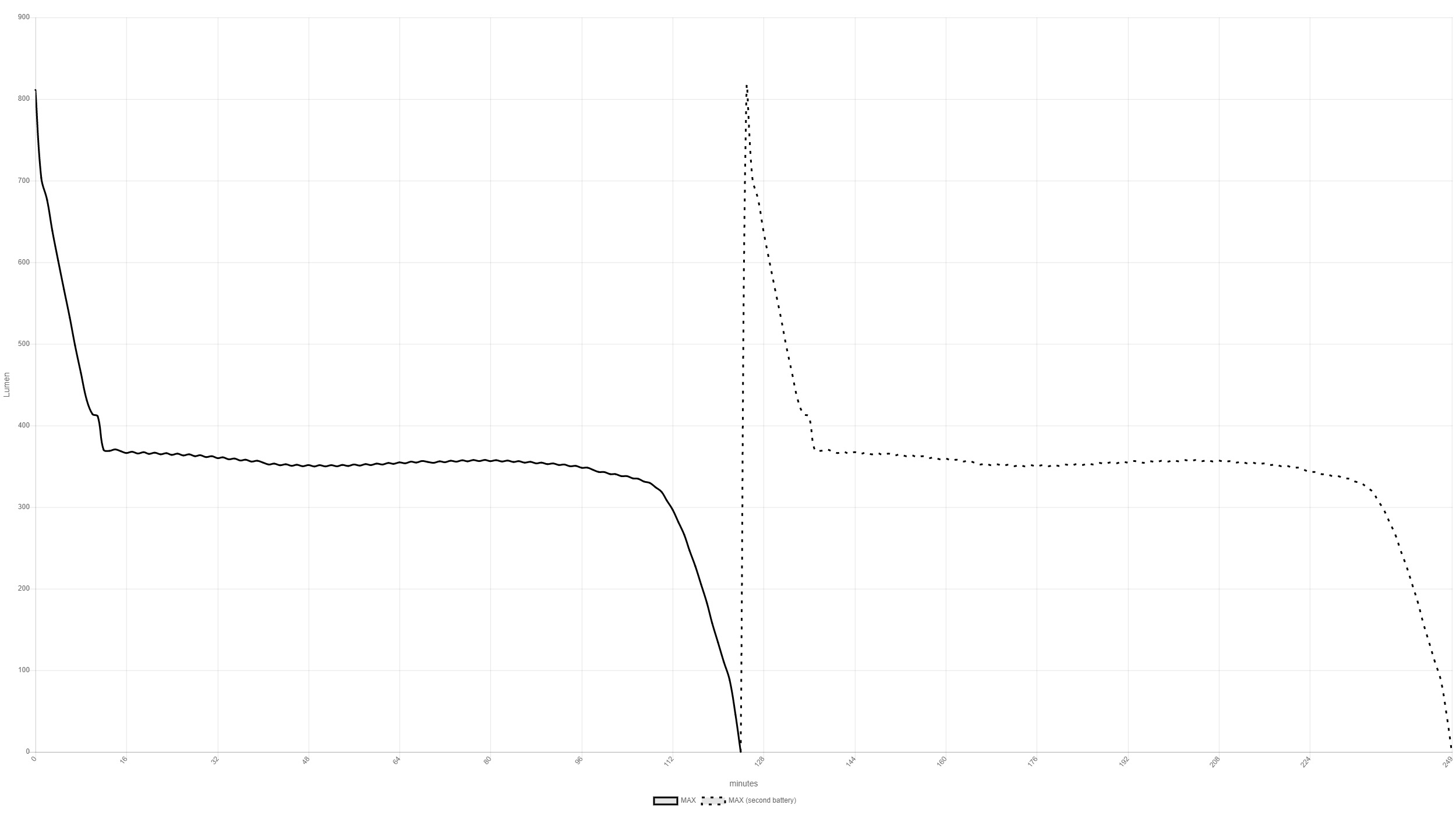 | Ljusflöde | Max 800 LumenHigh 350 LumenMedium 200 LumenLow 50 LumenStrobe 10 Hz |