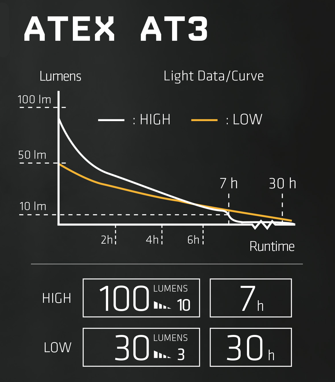 | Ljusflöde | High 100 LumenLow 30 Lumen |