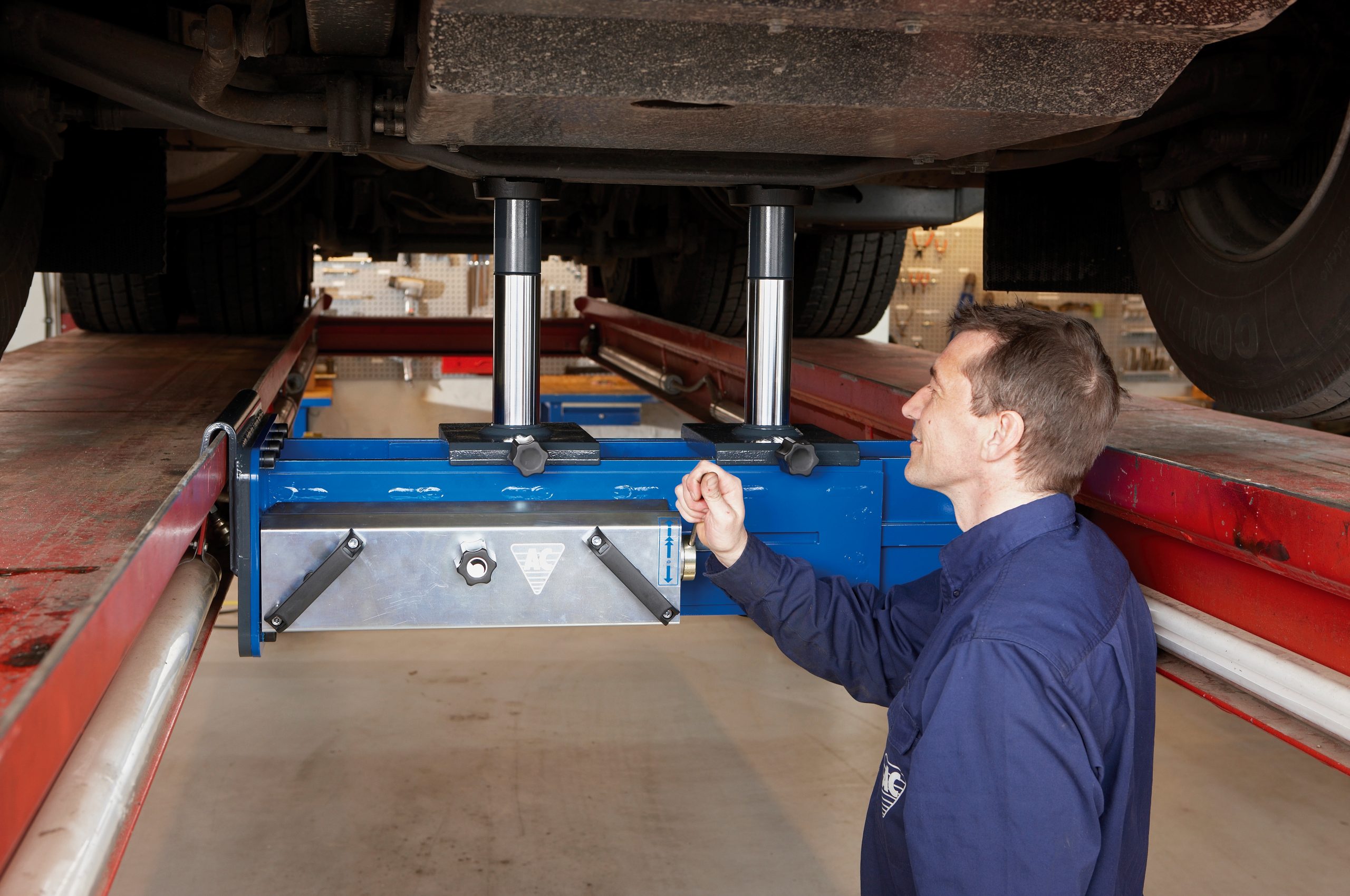 2 individuellt styrbara lyftcylindrar ger ett säkert och balanserat lyft. Sidledes glidande lyftcylindrar. Precis lufthydraulik med snabbgång. Med kontrollpanel i ergonomiskt korrekt arbetshöjd. Passar till alla lyfttyper tack vare justerbar ram*. Flexibel och höjdjusterbar - lyftsadelns höjd i förhållande till lyftens körbanor kan ställas in efter önskemål. Dödmansgrepp och övertrycksventil för maximal säkerhet. Inkl. 2 st förlängningar (100 mm).