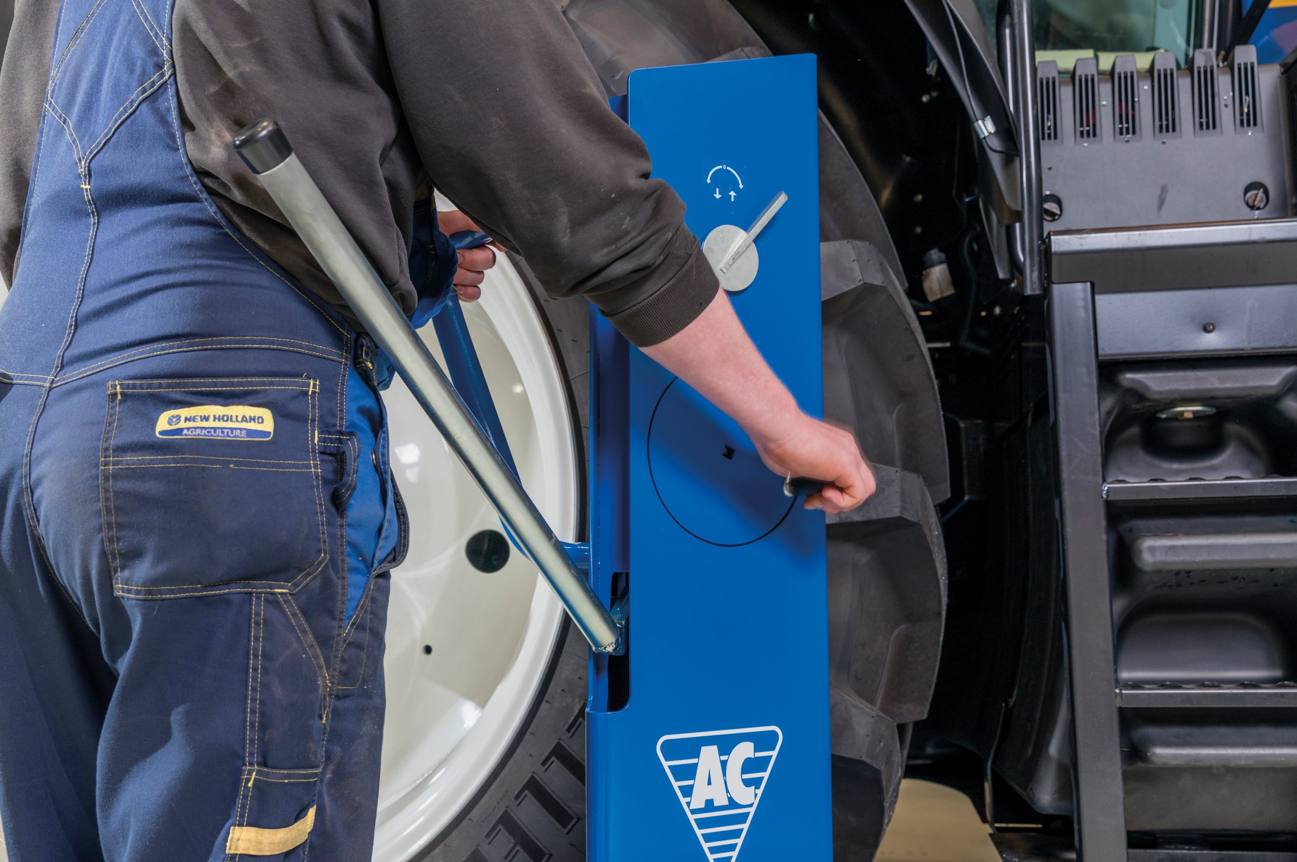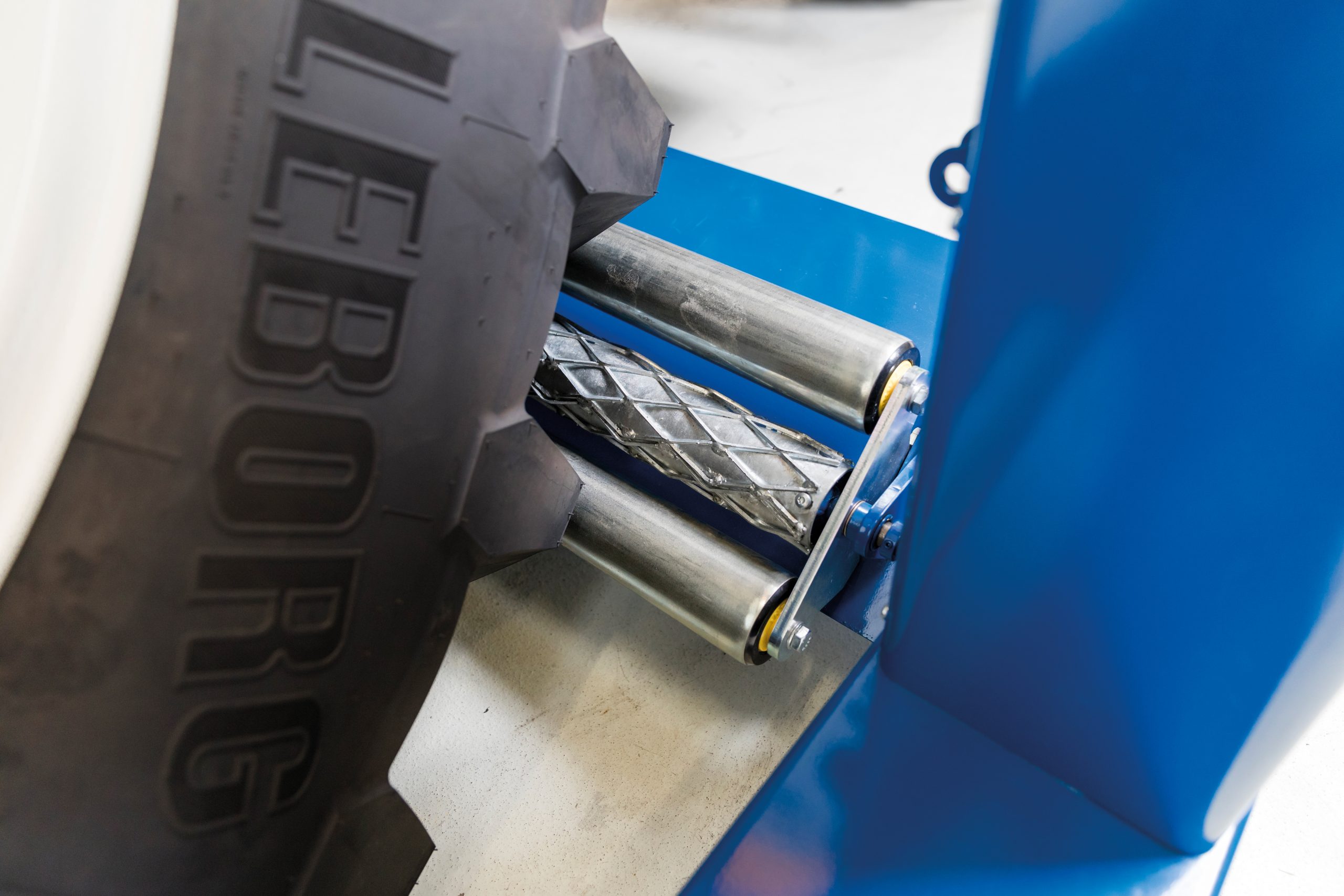 Enkel hantering av världens största hjul. Två robusta handtag och 4 st 200 mm pivåhjul gör den enkel att manövrera i verkstaden. En enkel brytare gör det mycket enkelt att öppna och stänga skänklarna. Ett handtag gör det enklare att vrida hjulen på vagnen. Hjulet kan säkras med ett spärrband för maximal säkerhet. Hjulstorlekar: min. Ø 1000 mm – max Ø 2400 mm. Hjulbredd: max 1200 mm. Optimerad förpackning för enkel leverans och minskad fraktkostnad.