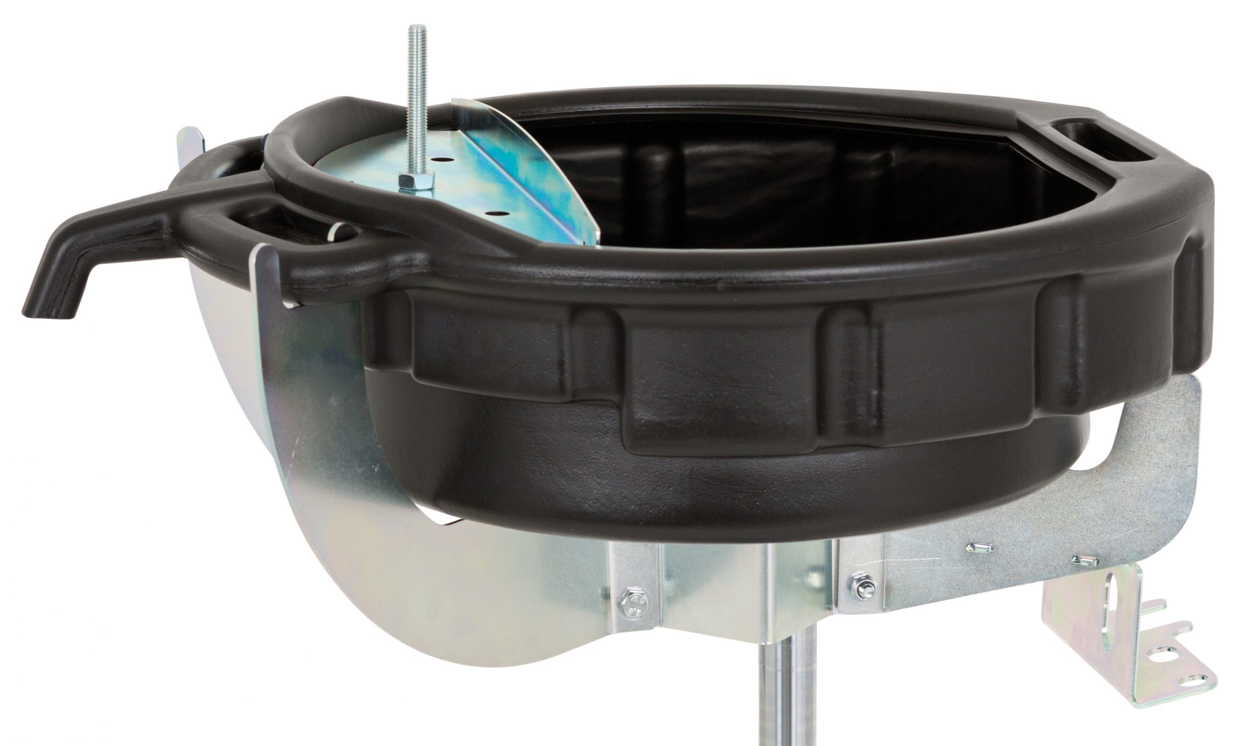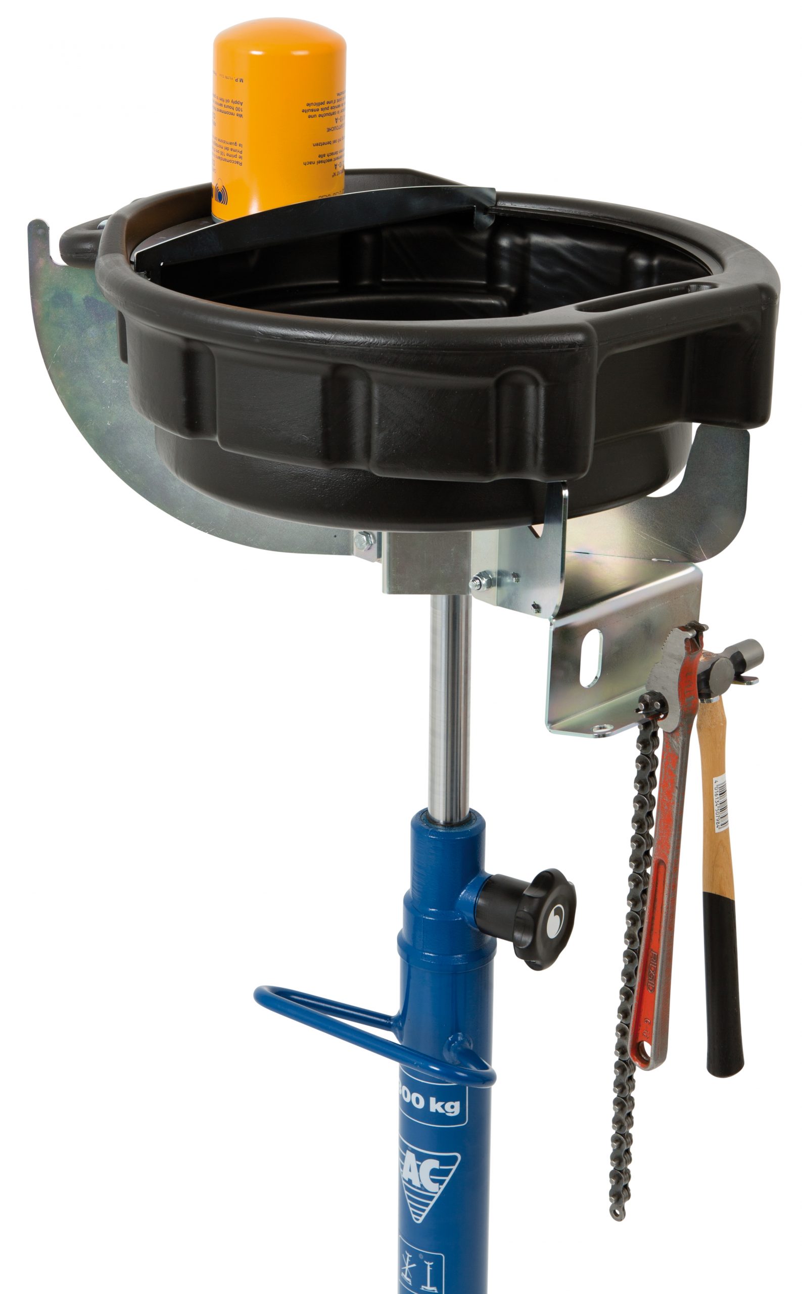 Kan monteras på ø 25-60 mm rör. Plats för verktyg, skruvar och smådelar. Särskild utformning möjliggör smidig dränering av oljefilter. Upphängd vippfunktion ger enkel tömning. Behållaren är olje-, syra- och kylvätskebeständig. Kapacitet: 15 liter