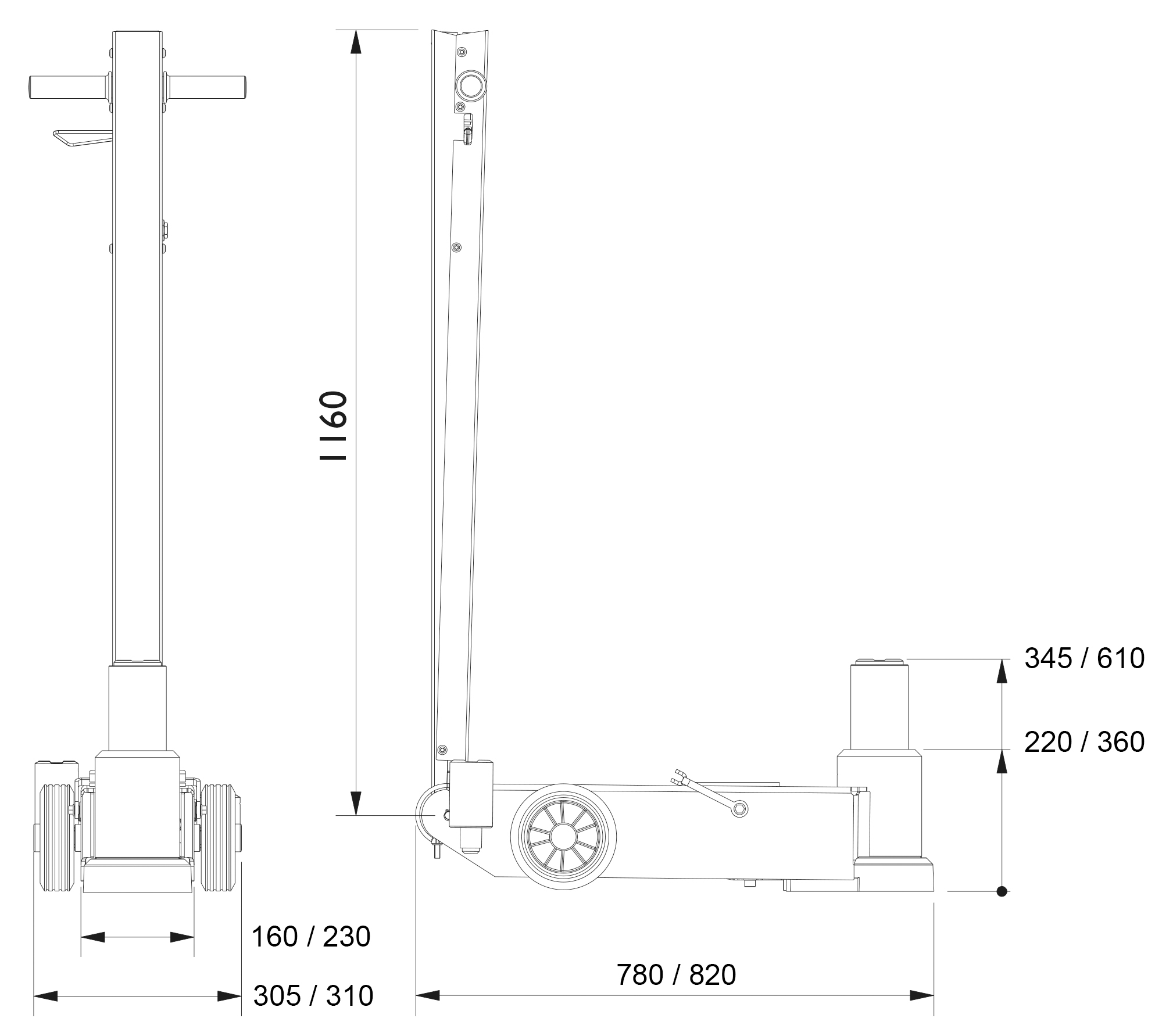 Min. höjd på 220 mm. Utformad för hård, intensiv och professionell användning. Hårdförkromad kolvstång säkrar lång livstid. Inbyggd säkerhetsventil skyddar mot överbelastning. Dödmansgreppet ger optimal säkerhet vid lyftning och sänkning Ergonomiskt handtag med tryckknappar Inkl. 2 st. förlängare (50/100 mm).