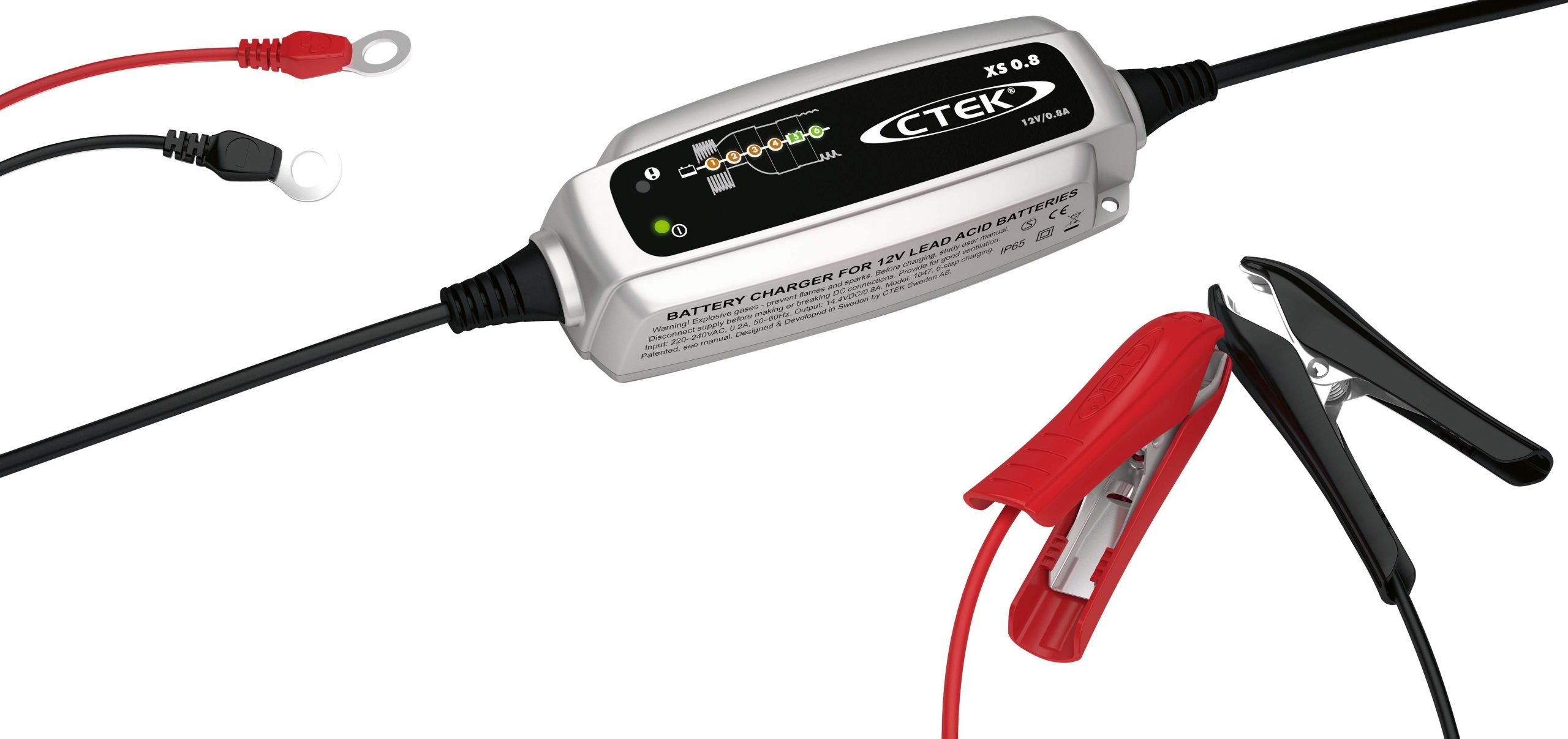 XS 0.8 är CTEK:s minsta 12V-laddare. Den är perfekt för laddning av mindre 12V-batterier. Den är också bra för underhållsladdning av ”normalstora” batterier som t.ex. bilbatterier. Hela laddningsprocessen går att följa på den unika displayen. XS 0.8 är en kompakt och helautomatisk sexstegsladdare för 12V-batterier mellan 1,2 och 32Ah och för underhållsladdning upp till 100Ah.