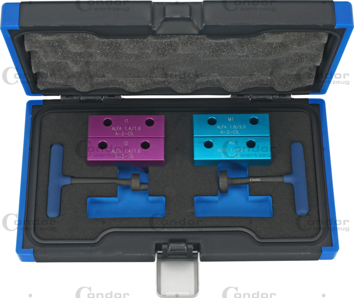 1.4, 1.6, 1.8 och 2.0 liter 16V bensinmotorer (Twin-Spark). Verktyget används främst vid kamremsbyte eller motorreparationer för att säkerställa att motorns komponenter är korrekt inriktade under arbetets gång. Genom att använda detta set kan mekanikern noggrant justera kamaxlar, vevaxel och andra rörliga delar för att motorn ska fungera optimalt. Det gör det också möjligt att bibehålla exakt motortiming, vilket är avgörande för att förhindra skador på motorns interna delar och säkerställa en lång livslängd.