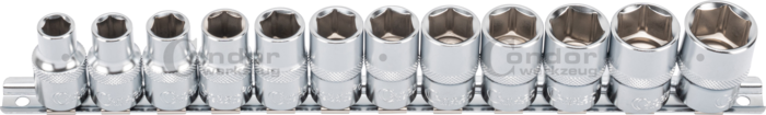 Hylsorna är tillverkade i krom-vanadiumstål och levereras monterade på en hållarskena som gör dem enkla att förvara och organisera i verktygslåda eller verktygsvagn. Den tydliga uppställningen gör det snabbt att hitta rätt storlek vid arbete.