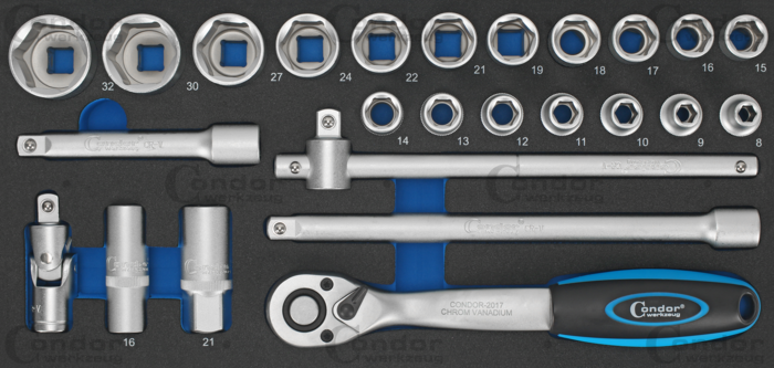 Hylsa set i foam är ett verktygsset med hylsor och tillbehör för arbete med muttrar och bultar, organiserat i ett foam-inlägg för verktygsvagn.