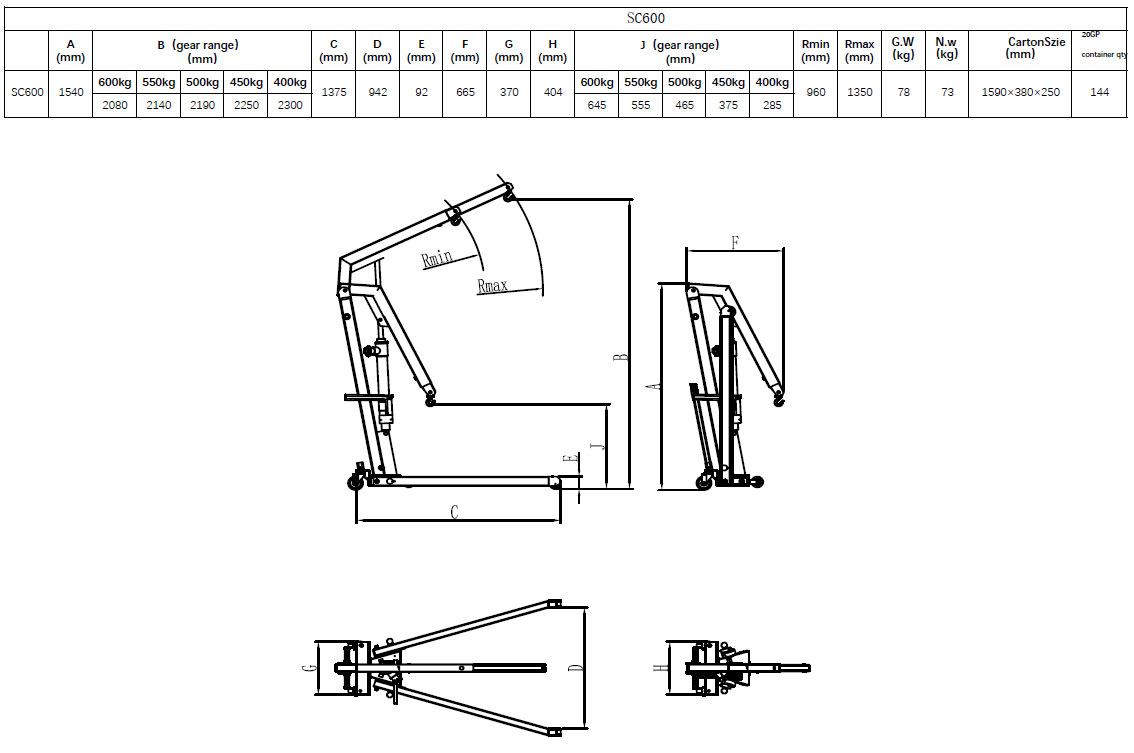 Kan fällas ihop på några få sekunder för snabb och enkel förvaring. Hopfälld kräver kranen minimalt med plats på verkstadsgolvet. Utdragsarm med stor lyftkapacitet, även i det yttersta läget. (*Se kapacitetsöversikt). Hårdförkromad kolvstång och pumpkolv säkrar lång livstid. Inbyggd säkerhetsventil skyddar mot överbelastning. 360° svängbara bakhjul säkerställer att kranen är manöverduglig även med full belastning. Utrustad med 360° vridbar krok. Handmanövrerat dödmansgrepp ger optimal säkerhet vid sänkning.