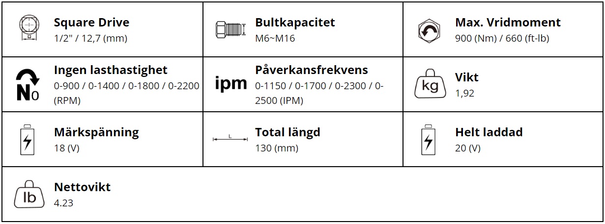| Storlek | M7 Compact Mutterdragare 1/2" Ink.2x5.0ah Batteri & Laddare |