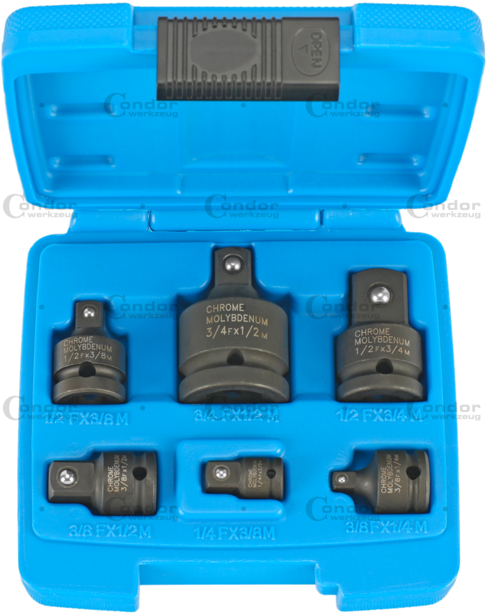 | Storlek | Adapter Set, 6 delar., 1/4-3/4" 4-kantsfäste, CrMo |