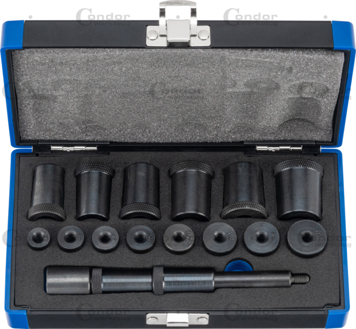 med 8x 3-stegsadaptrar för passning i stödlager: 12.6 x 10.8 x 19.2 mm, 14.8 x 12.2 x 19.4 mm, 15.0 x 13.5 x 19.3 mm, 16.0 x 14.7 x 19.7 mm, 17.7 x 15.8 x 19.4 mm, 19.0 x 17.1 x 19.3 mm, 20.0 x 18.3 x 19.1 mm, 21.6 x 20.0 x 19.1 mm