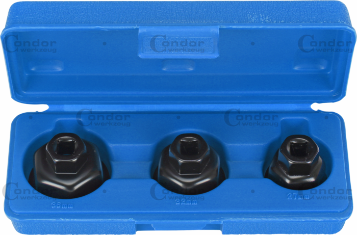 3 Oljefilternycklar: 27 mm x 6 pt., 32 mm x 6 pt., 36 mm x 6 pt.