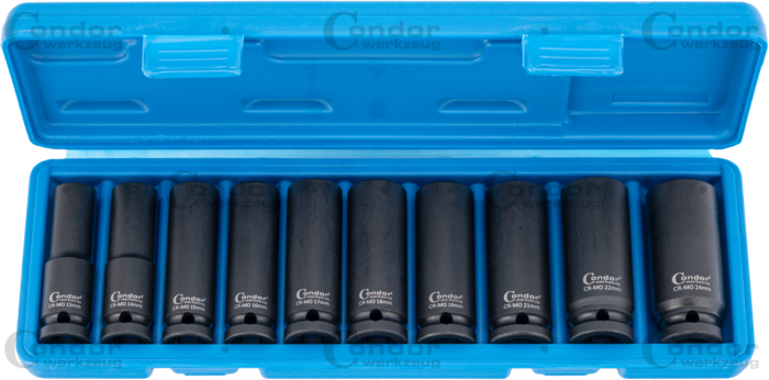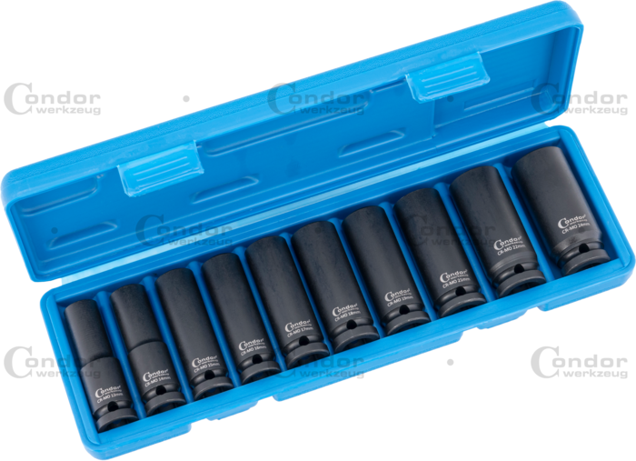 Djup krafthylsa set är ett hylsset för arbete med muttrar och bultar där extra räckvidd krävs, anpassat för användning med slagverktyg.