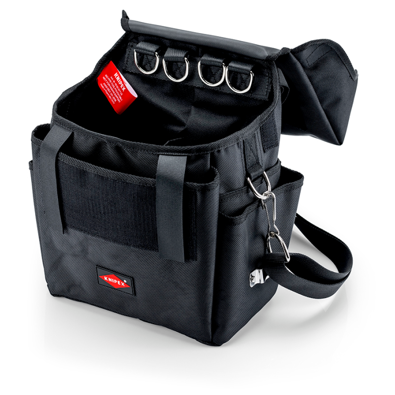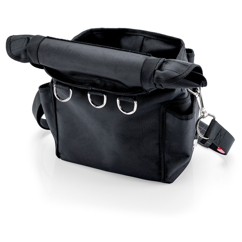 - 11 D-ringar i stål: 8 för verktyg med fånglina och 3 för att fästa väskan i klättringsutrustningen – passar även vänsterhänta