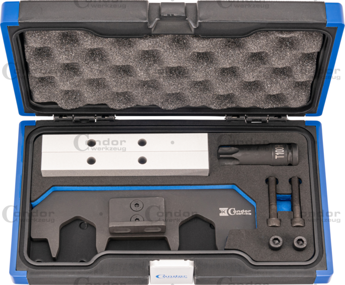 Detta motoreinställningsverktygssats är perfekt för 1,5L, 1,6L och 2,0L bensinmotorer i Mercedes-fordon som A-Klass, B-Klass, C-Klass, CLA, E-Klass, GLA, GLB, GLC, GLE, GLK, SLC och SLK. Satsen används för att fixera kamaxlar vid byte av kamkedja eller motorreparation, vilket säkerställer korrekt inställning under reparationen. Passar motorer med specifika motorkoder som 133980, 260920, 264915, och fler. Ett måste för professionella reparationer och kamkedjebyten på Mercedes-motorer.