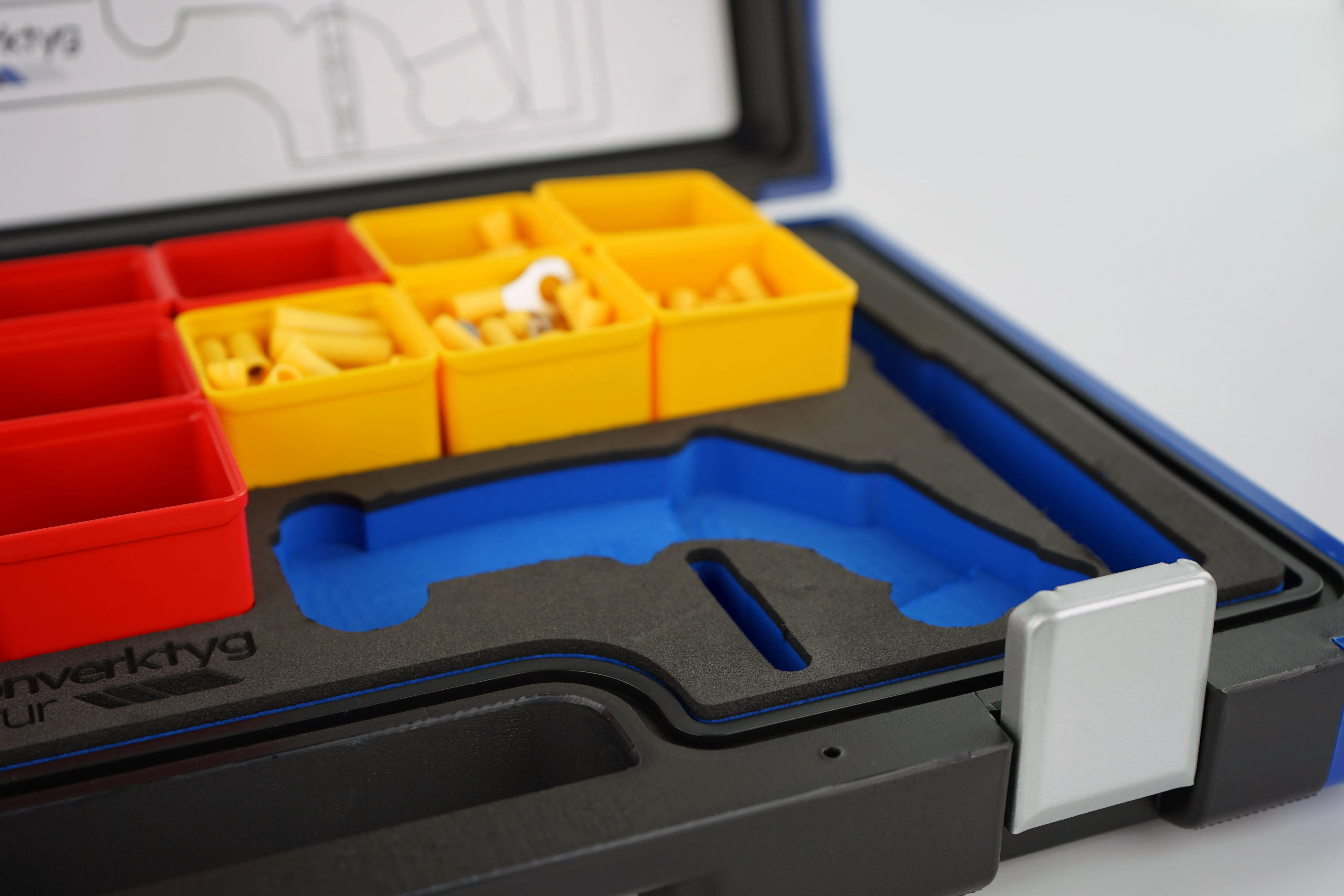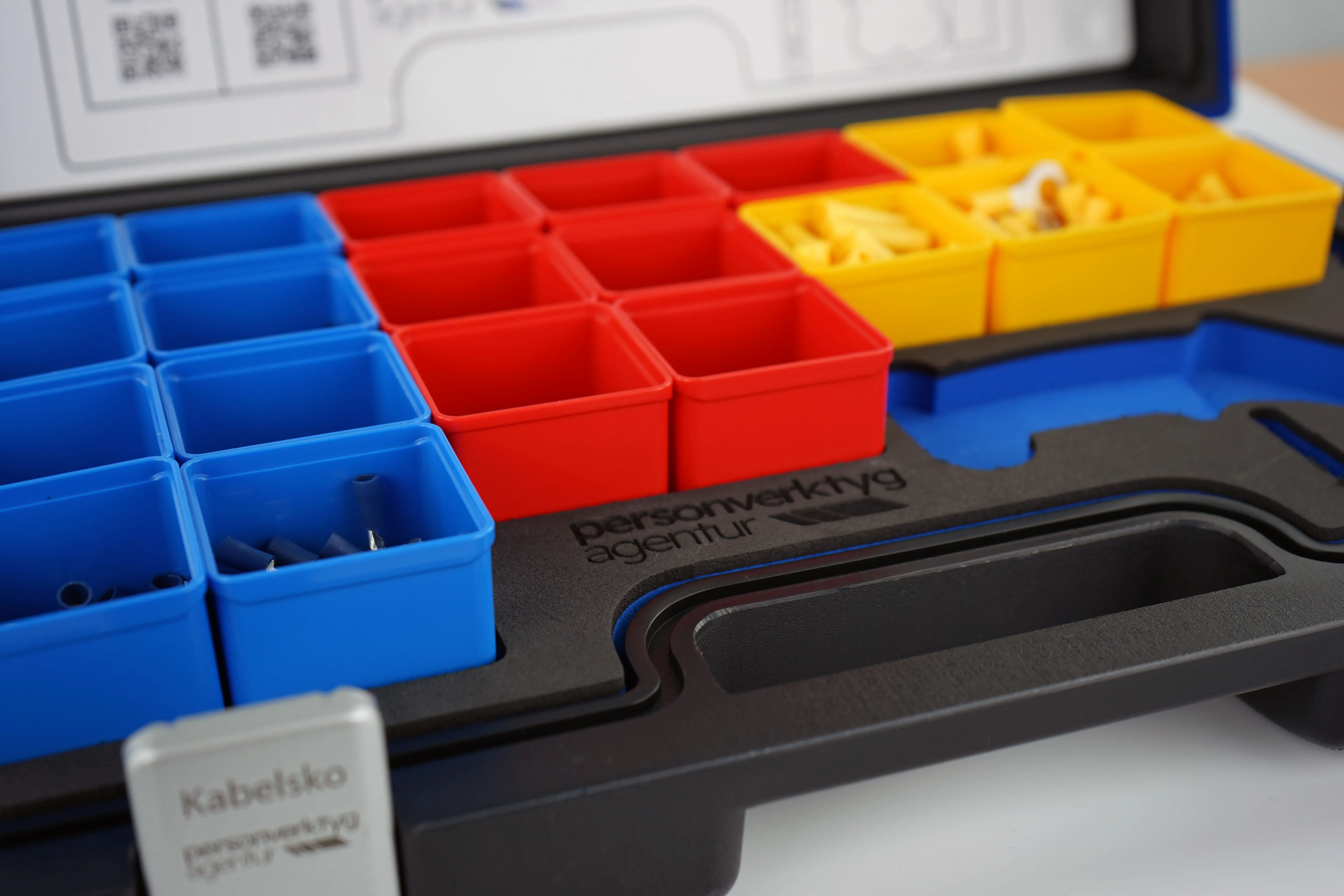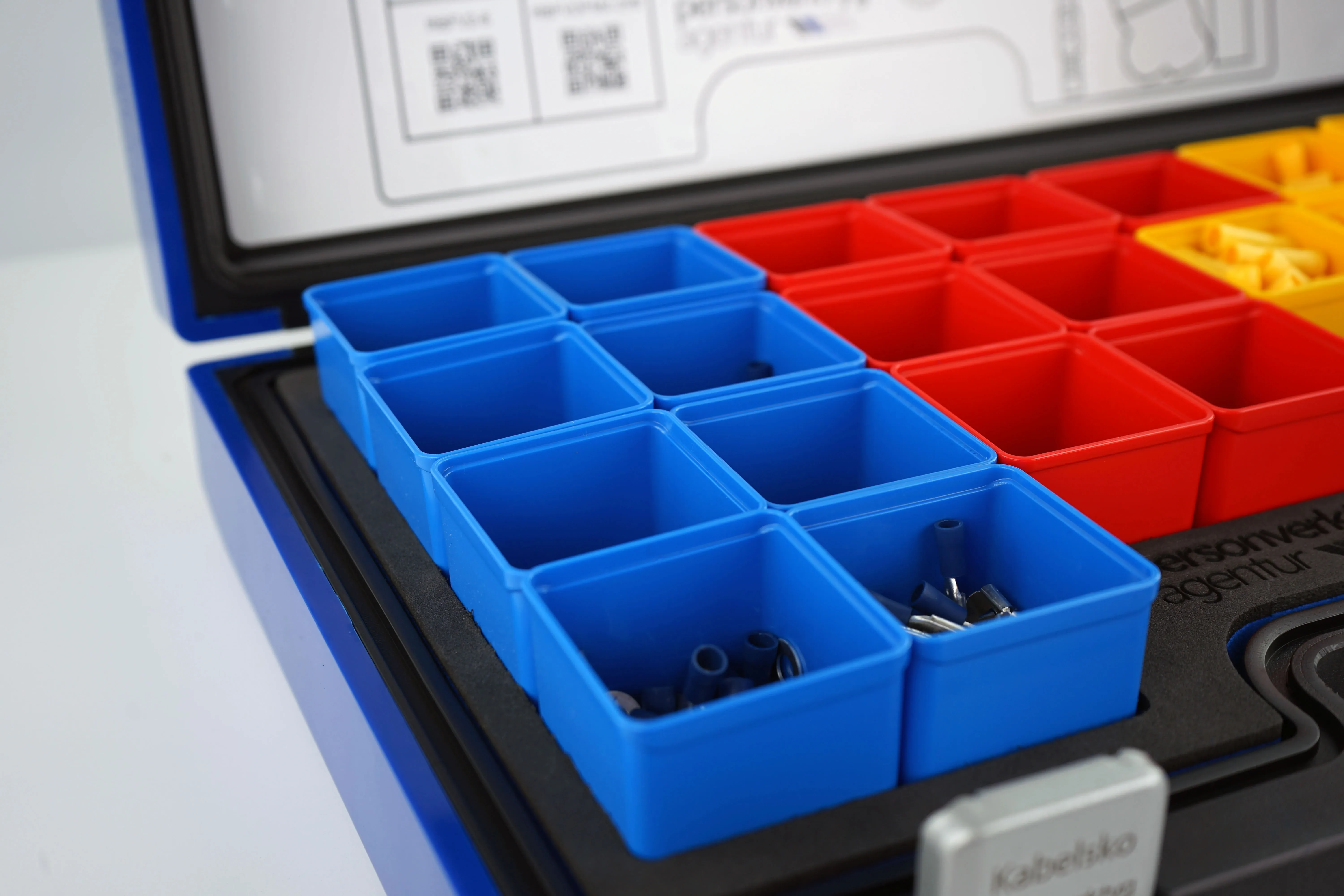 Perfekt för elektriker, mekaniker och tekniker som vill ha alla vanliga kabelskotyper nära till hands – snyggt sorterat och färdigt att använda.