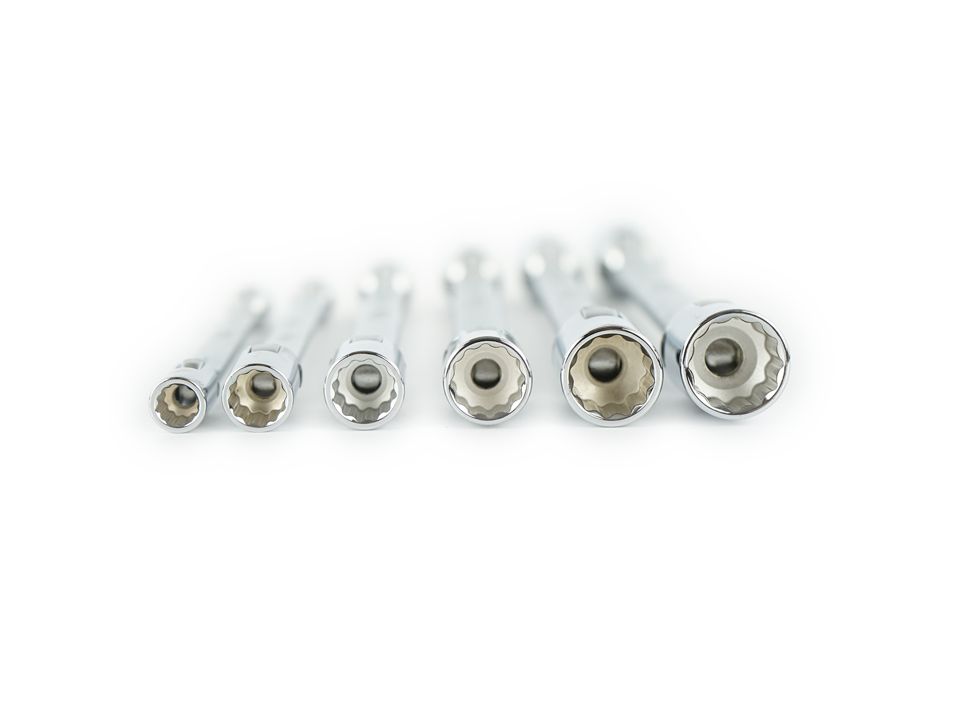Lednyckel-hylsset i 12-kantsutförande med sex nycklar i storlekar från 8 till 19 mm, utformat för arbete i trånga eller svåråtkomliga utrymmen i verkstad och servicearbete.