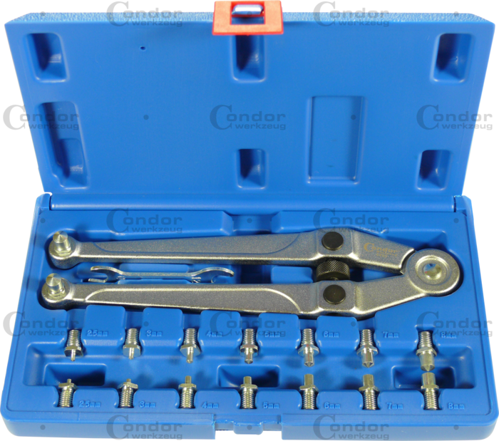 Haknyckelsats med utbytbara stift för arbete med låsmuttrar och spårade muttrar.