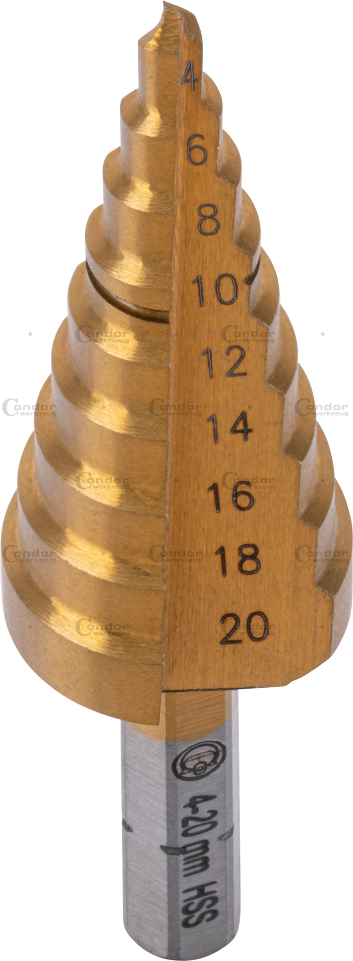 | Storlek | Stegborrbits, med kantbrytare, HSS, titanbelagd, 4-20 mm |