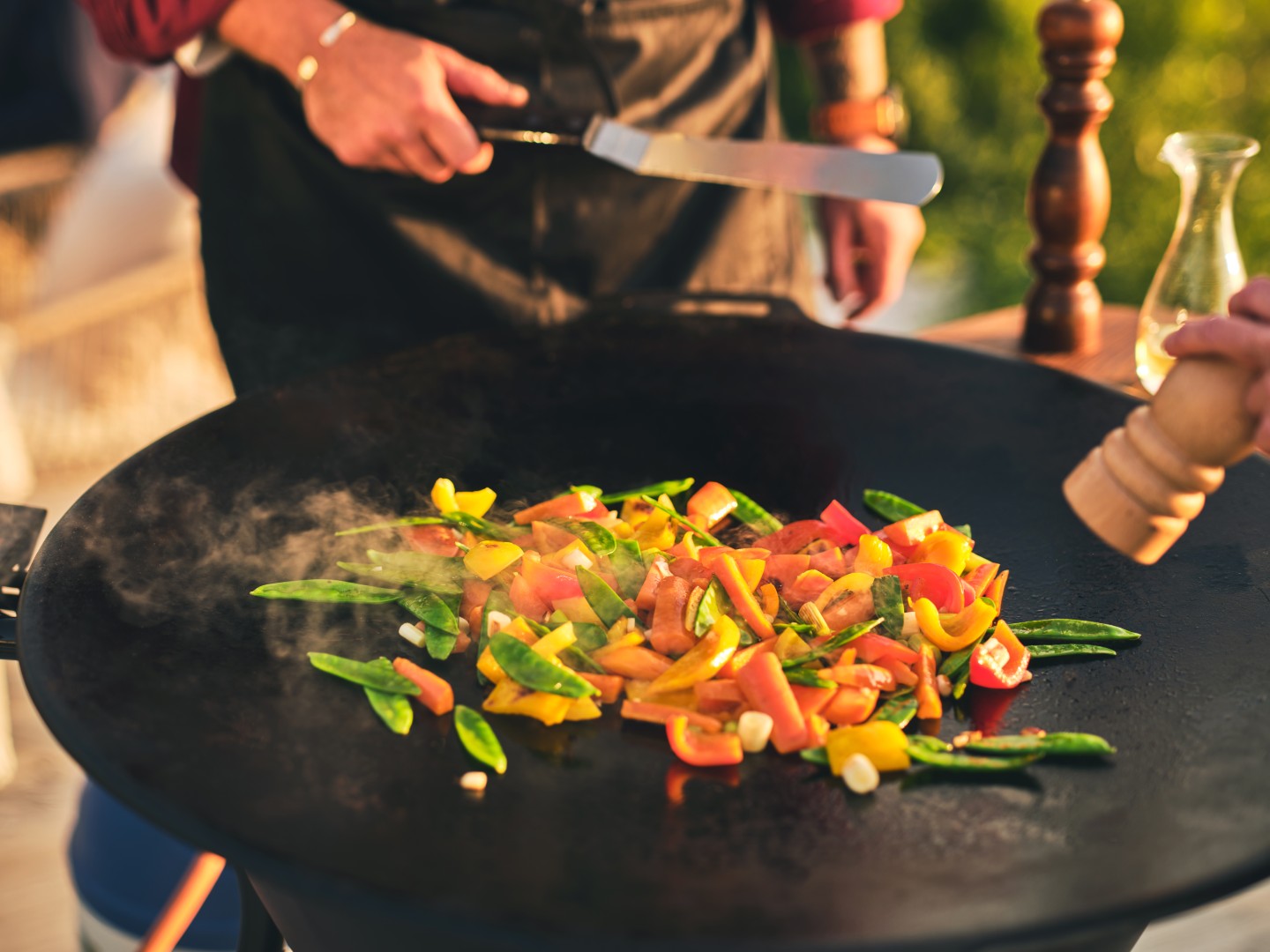 Elegant stekhällsset som inkluderar en emaljerad gasolbrännare och ett stadigt stativ i metall med långa ben i D-profil. Setet innehåller även en praktisk hylla för förvaring och en stekhäll i varmvalsat stål med en diameter på 78 cm. Gasolbrännaren har vred med integrerad tändning och tydlig markering som gör det enkelt att veta hur mycket värme som fördelas över hällen. Värmen regleras individuellt på de två gasolringarna, vilket ger möjlighet att skapa olika temperaturzoner på hällen. Setet har också ett skålformat vindskydd som effektivt skyddar lågorna. CE-märkt med effekt 14,6 kW och gasförbrukning 9621025 g/h. Arbetshöjd 90 cm. Stekhällen bör förvaras torrt när den inte används.