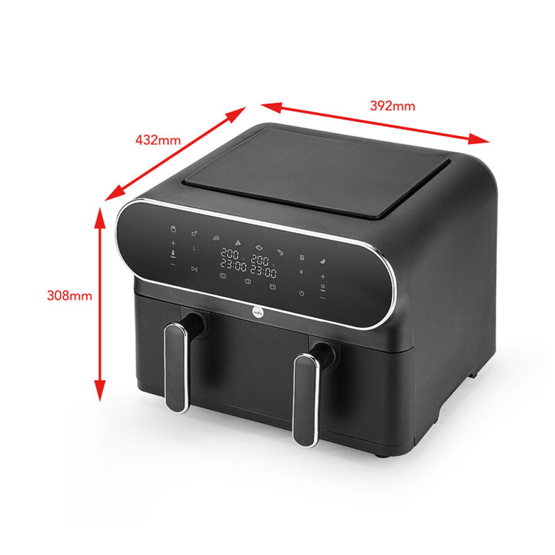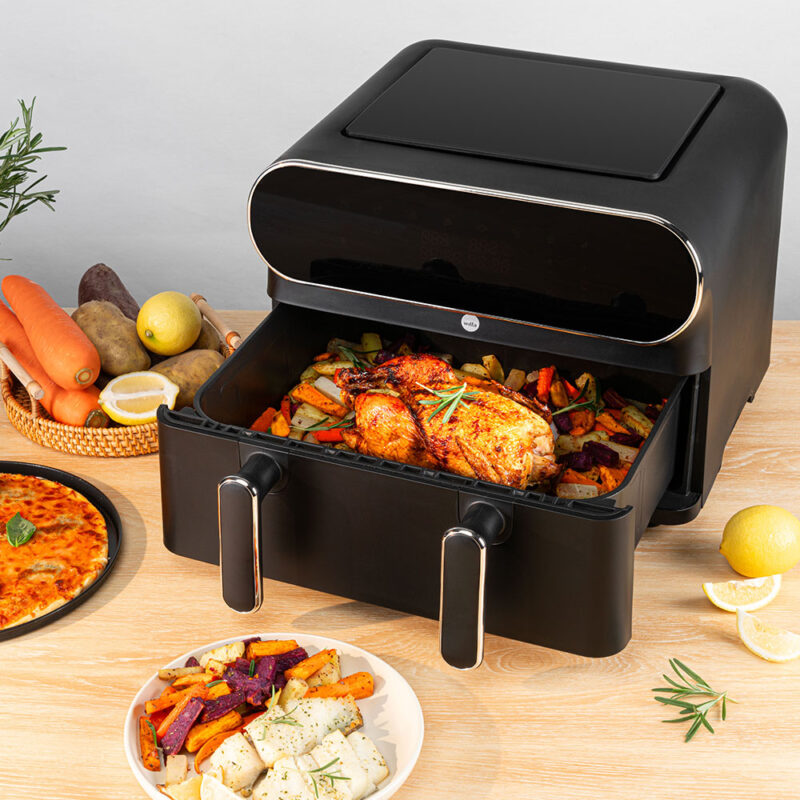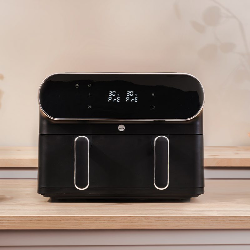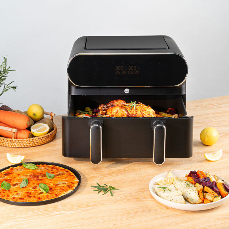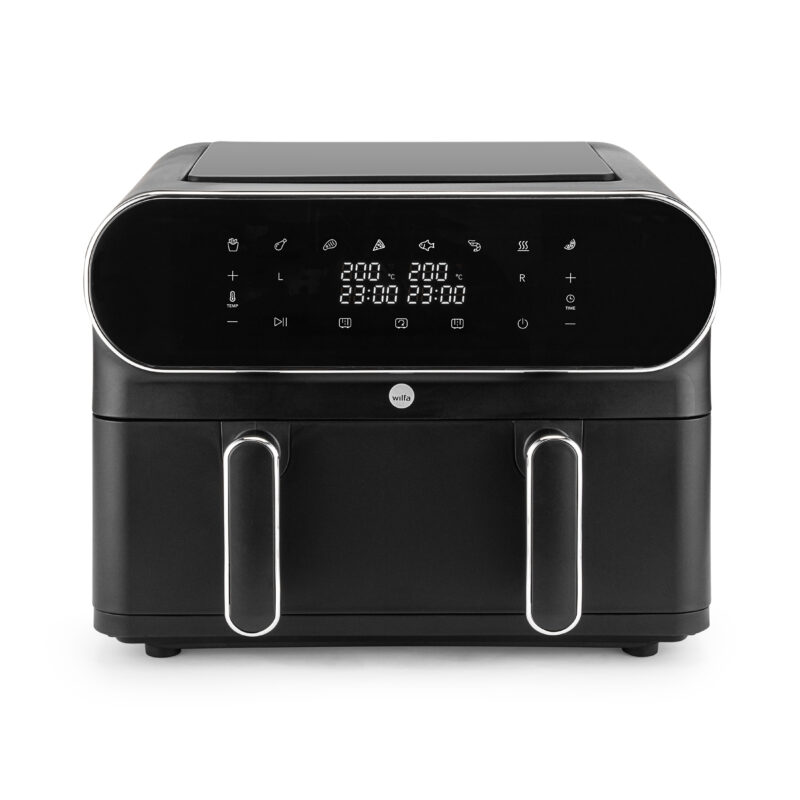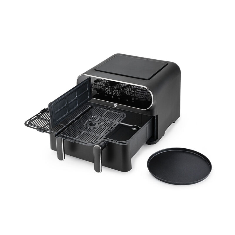 Dual Zone är en stor airfryer på 11 liter där du även har möjlighet att dela upp airfryern i två matzoner på 2×5,5 liter. Det gör det enkelt att laga två olika typer av ingredienser/rätter på samma gång. Med synkroniseringsfunktionen säkerställer airfyern att ingredienserna i båda zonerna blir färdiga samtidigt.