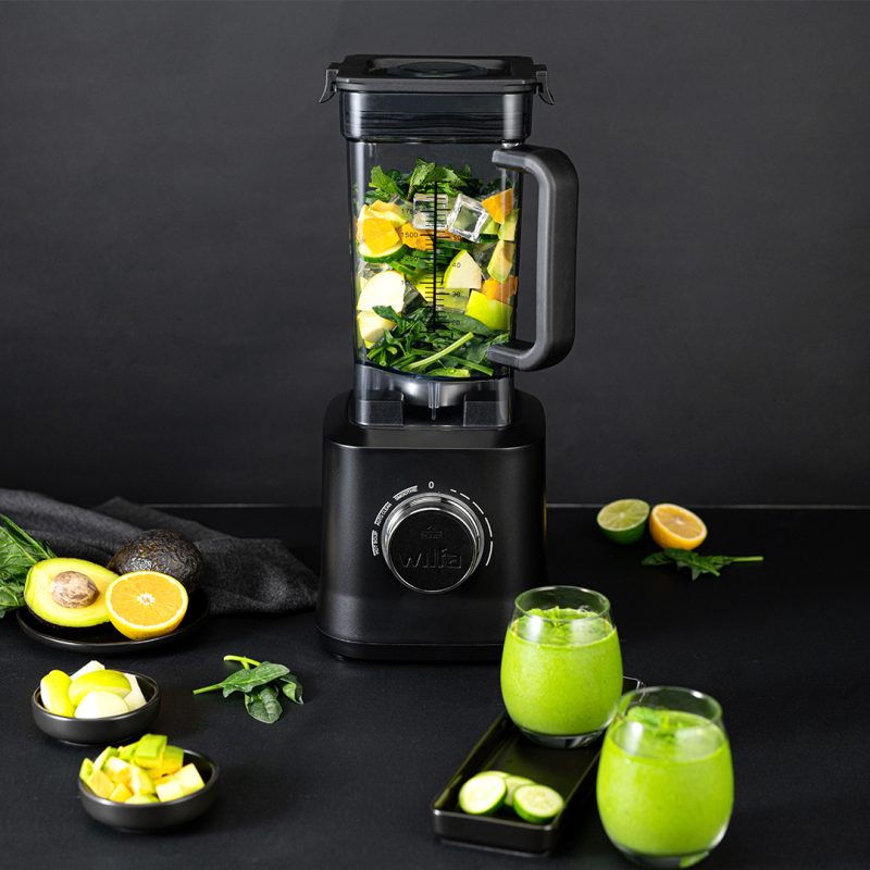 Powerfuel 1800 är en höghastighetsblender designad och utvecklad för att enkelt mixa stora mängder ingredienser, både hårda och mjuka. Tack vare sin höga hastighet kan den även värma upp innehållet och klarar temperaturer på upp till 100 grader. För att uppnå detta har vi kombinerat en kraftfull motor på 1800 W med sex vassa knivblad och en stor tritan-kanna på 1,8 liter.