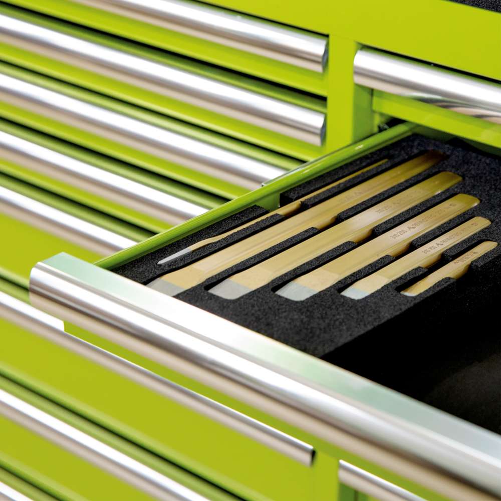 Med exakta urtag för förvaring på arbetsbänken och i verkstadsvagnen
