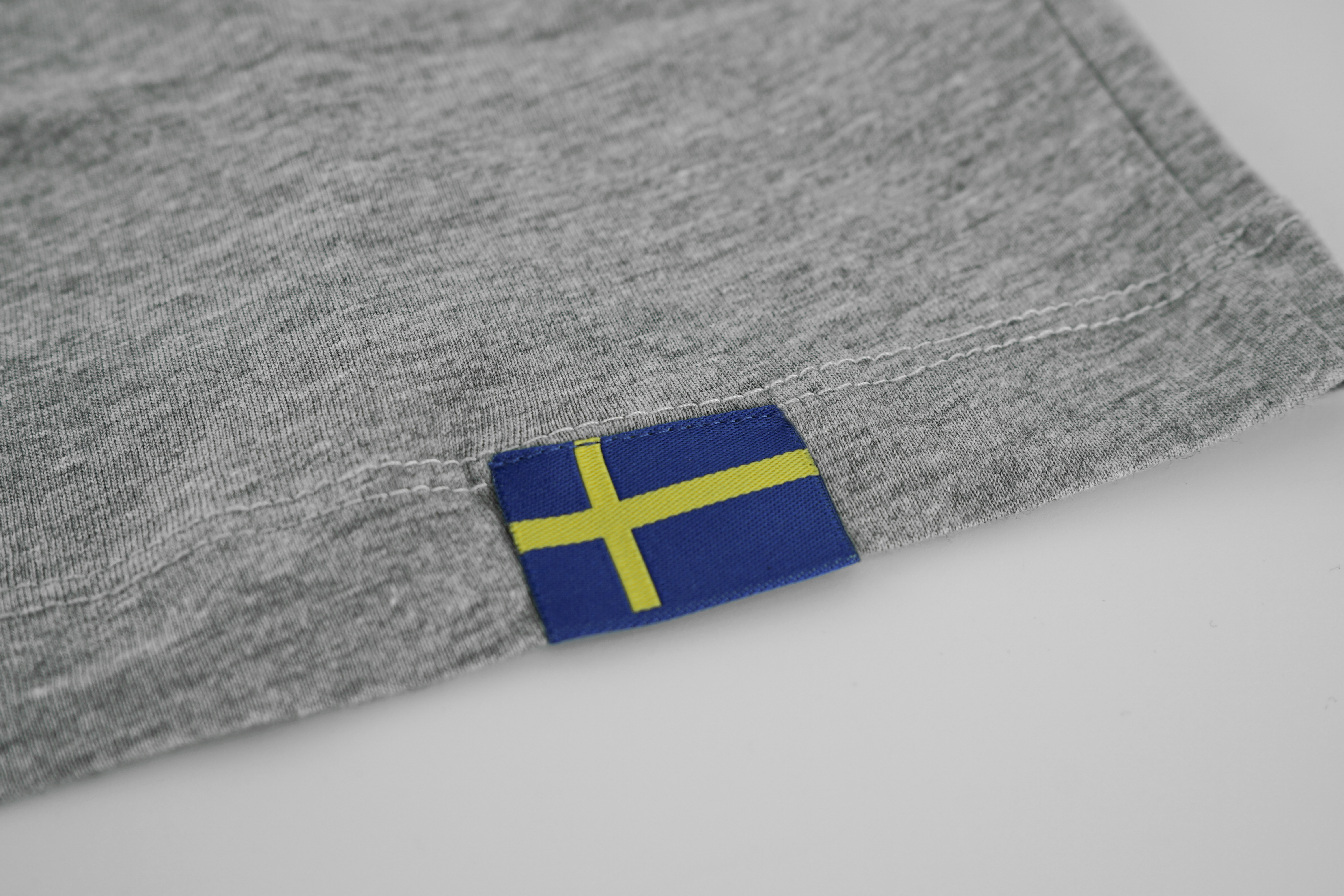 T-shirten har en förstärkt krage som behåller formen och en extra längd som gör att den sitter perfekt även på längre kroppar – lika snygg att bära utanpå som instoppad. En diskret men stolt Sverigeflagga i avslutet sätter pricken över i:et och ger plagget en unik och stilren detalj.