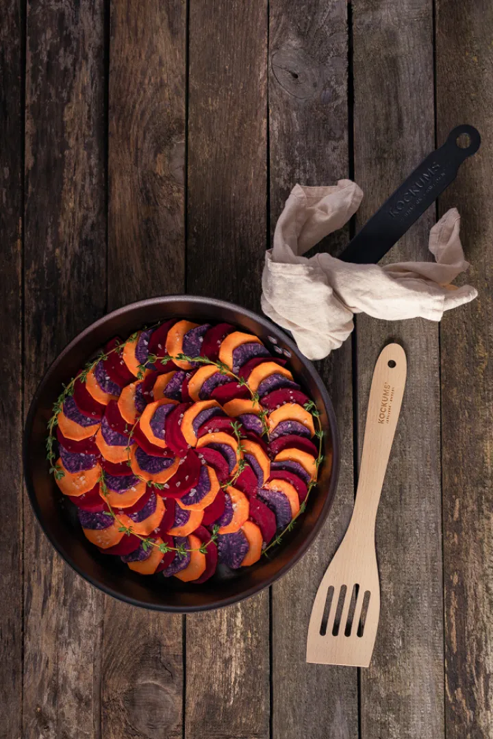 Designen med rakare och högre kant ger stekpannan en större bottendiameter. Du får i Kockums Jernverks stekpanna en större stekyta jämfört med andra stekpannor i samma storlek.