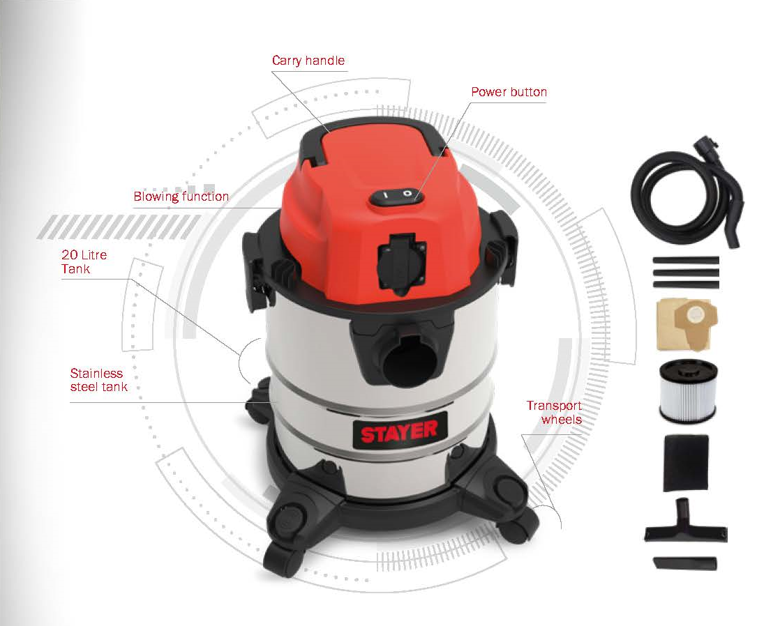Inklusive 1,5m sugslang, 3-delat rör, filterpåse, HEPA-filter, förfilter, golvmunstycke och plattmunstycke
